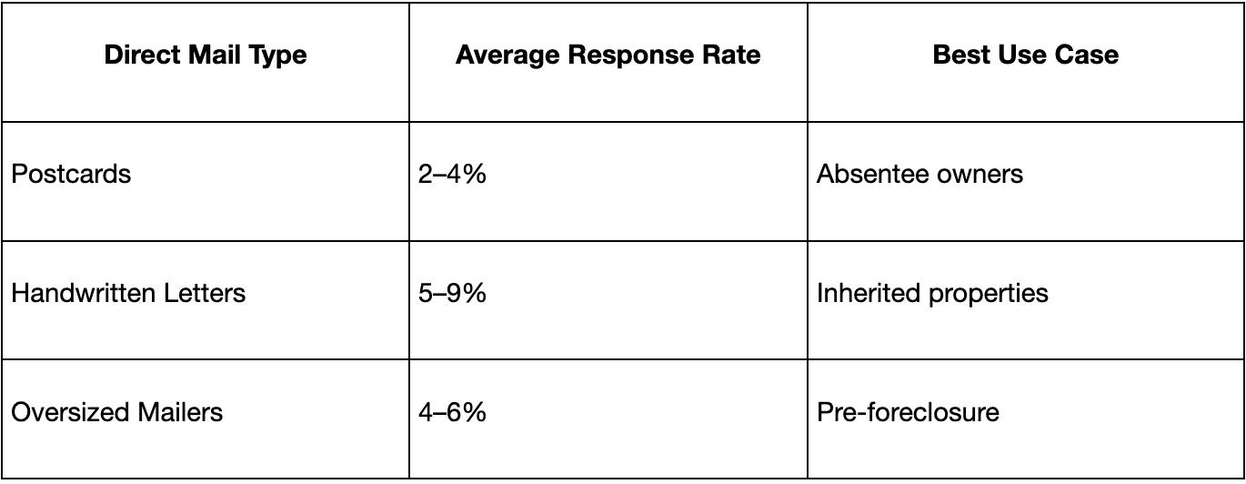 Direct mail remains an underrated strategy, especially for reaching older homeowners who may not be as active online. Postcards, letters, and even handwritten notes can generate calls from sellers who haven’t considered digital channels.